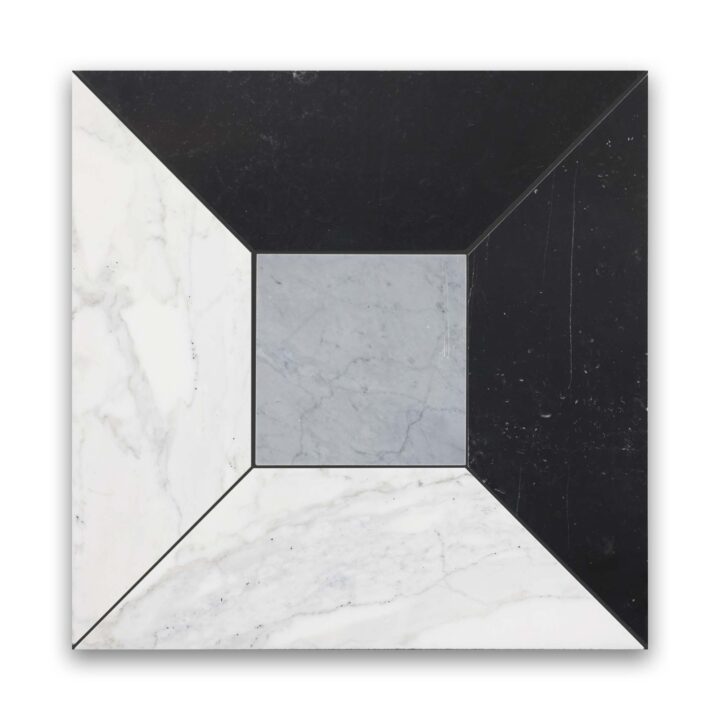 Revel in the play of light and texture as you adorn your space with Kaleidoscope Cube Calacatta with Tulip Black and Bardiglio marble mosaic. Created in partnership with Young Huh, this mosaic artfully combines the timeless beauty of Calacatta marble with exquisite Bardiglio and Tulip Black accents. The cube pattern creates a whimsical and modern design that adds a touch of luxury as you adorn your space with this artistic and sophisticated masterpiece.