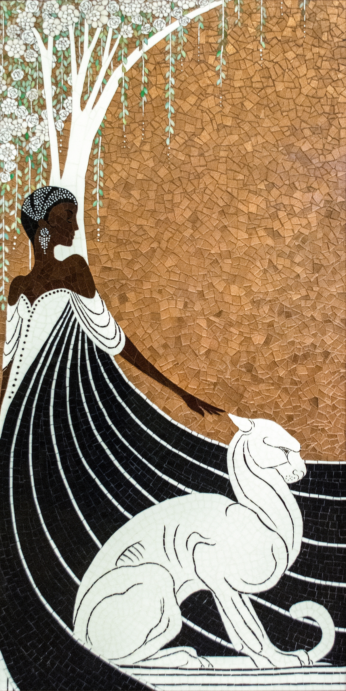 La Panthère Blanche, a hand-cut jewel glass mosaic, shown in Absolute White, Obsidian, Champagne, Peridot, Emerald, Mirror, and 24K Gold.