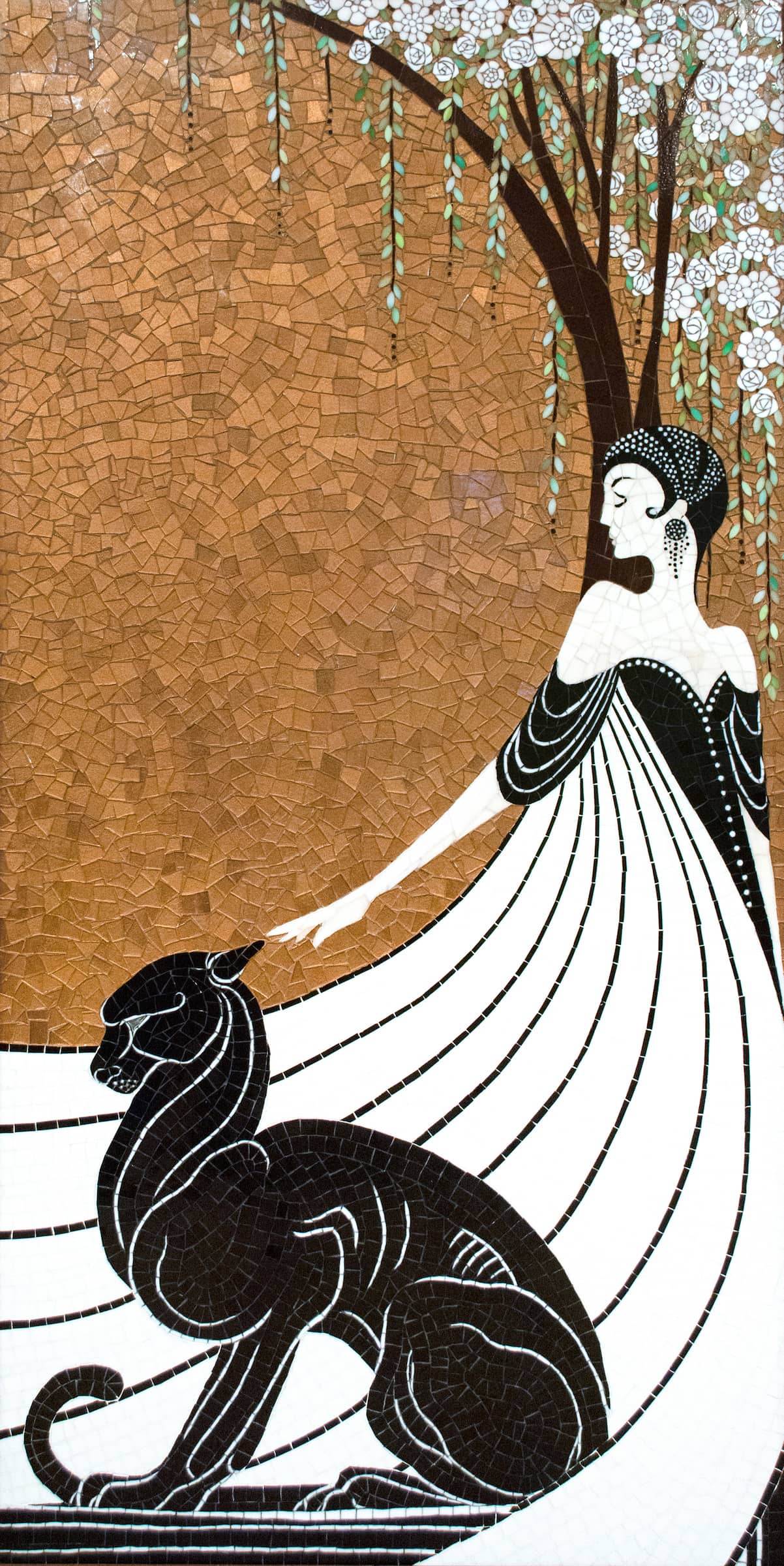 La Panthère Noire, a hand-cut jewel glass mosaic, shown in Absolute White, Obsidian, Champagne, Peridot, Emerald, Mirror, and 24K Gold.