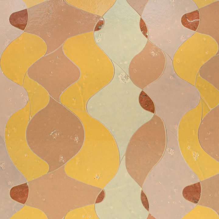 Lava Lamp, a waterjet mosaic shown in Tulip, Honeysuckle, Primrose, and Goldenrod Glazed Basalto™ with polished Rojo Alicante.