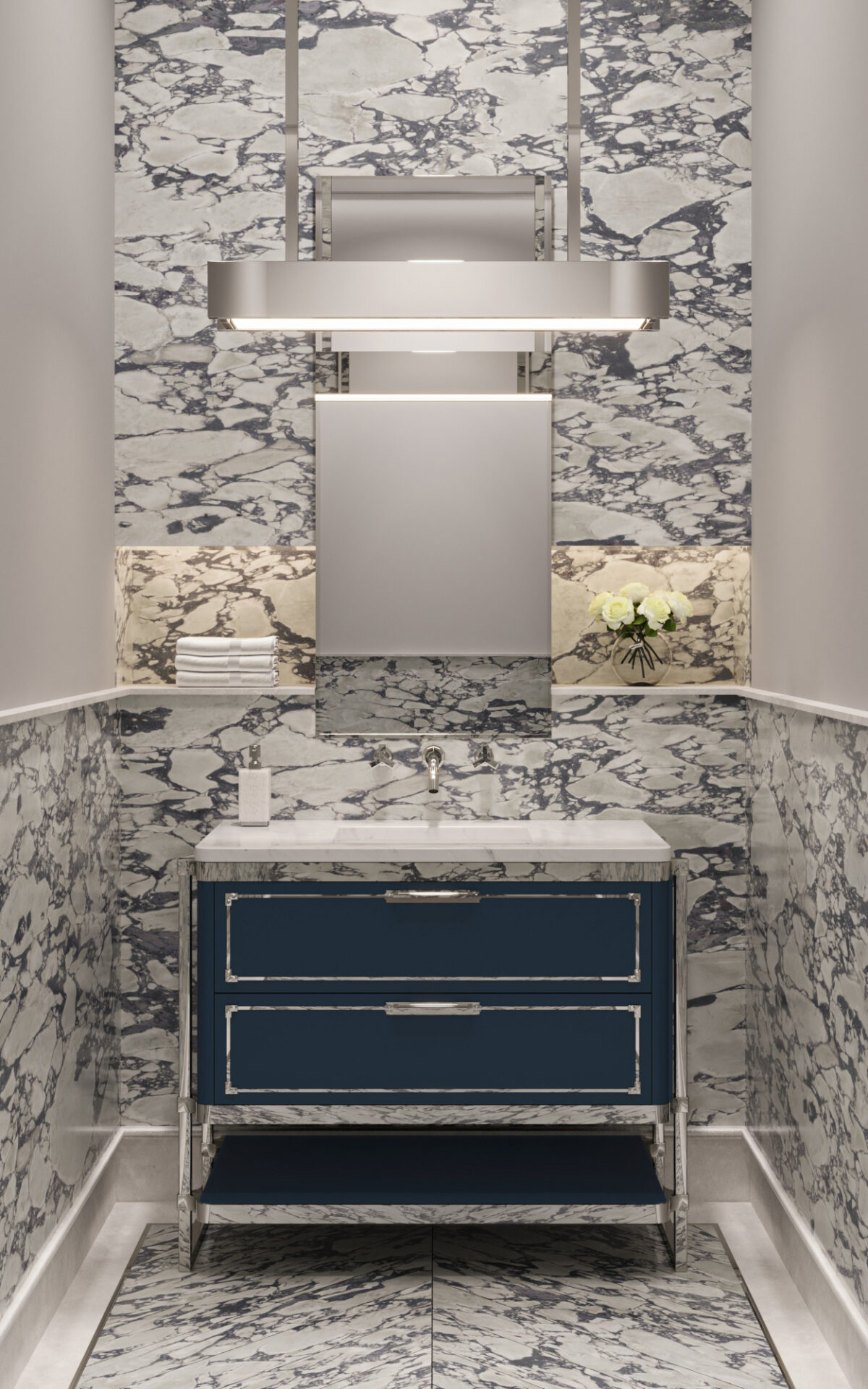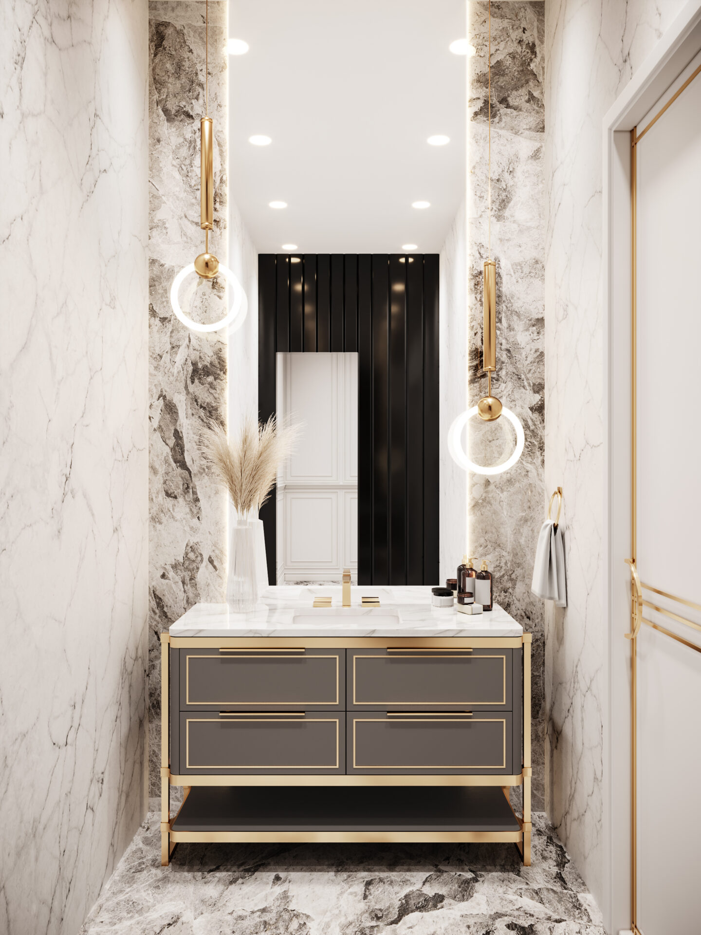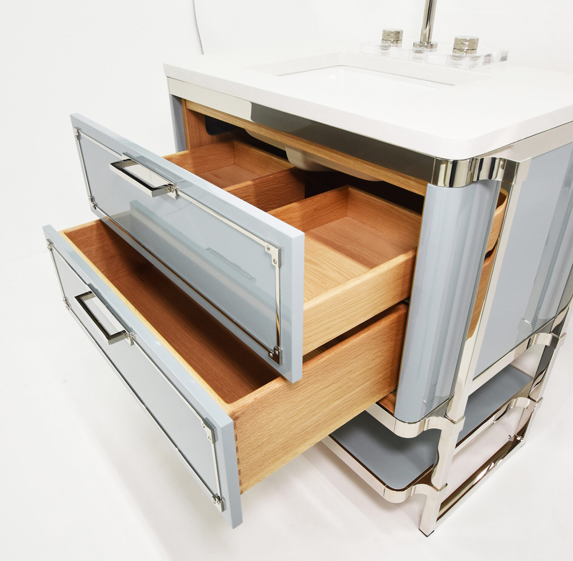 The Logan – 524 vanity is similar to the Lucas design. The Logan features a combination of doors and drawers as well as an open shelf for maximum storage space. Each configuration is equipped with unique rounded corners and a metal bracket design. This is one of the many customizable vanity options available at Decorative Materials.