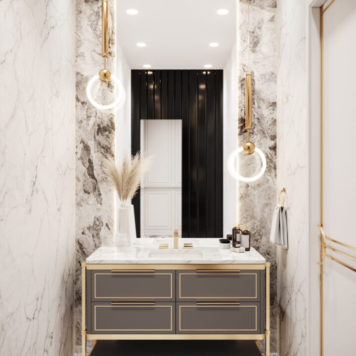 The Logan – 524 vanity is similar to the Lucas design. The Logan features a combination of doors and drawers as well as an open shelf for maximum storage space. Each configuration is equipped with unique rounded corners and a metal bracket design. This is one of the many customizable vanity options available at Decorative Materials.