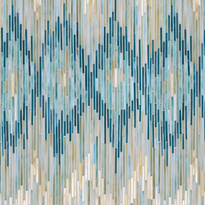 Loom, a hand-cut mosaic shown in Quartz, Aquamarine, Tanzanite and Turquoise jewel glass, is part of the Ikat Collection by New Ravenna for Decorative Materials - NOTES