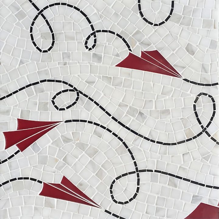 Loop De Loop, a waterjet and hand-cut mosaic shown in tumbled Calacatta, polished Nero Marquina, and Carmen Red Serenity glass. Part of the Kiddo Collection by Cean Irminger. Dimension reflect image shown.