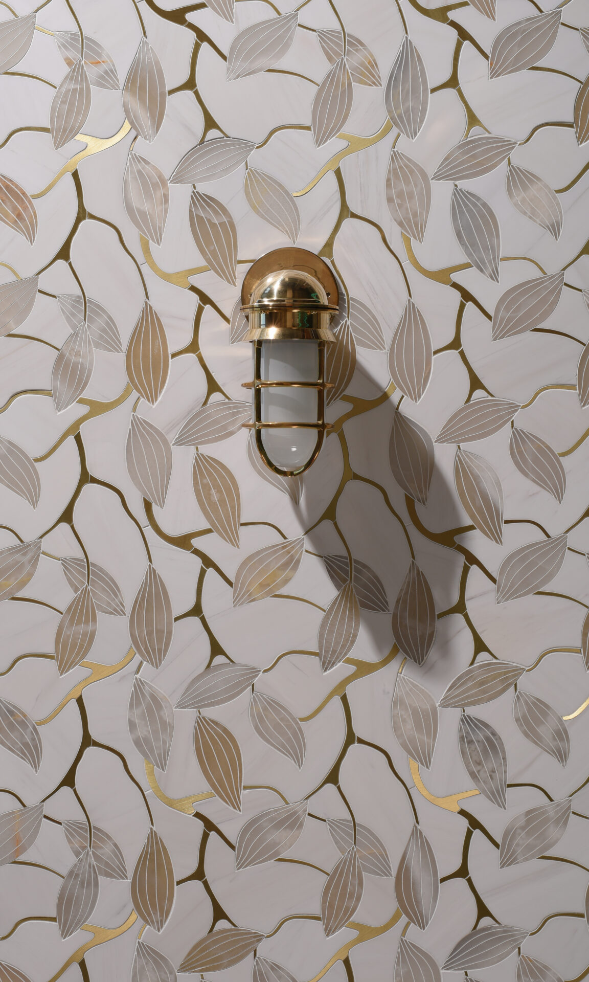 Magnolia Buds, part of the French Quarter Collection, is a water-jet mosaicinspired by the soul of New Orleans! Shown here in Arctic White, Brass, Pure White Onyx, and White Onyx.