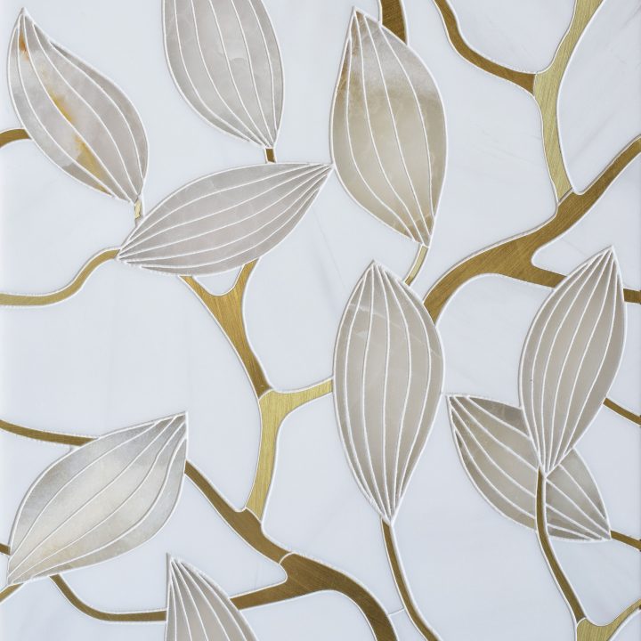 Magnolia Buds, part of the French Quarter Collection, is a water-jet mosaicinspired by the soul of New Orleans! Shown here in Arctic White, Brass, Pure White Onyx, and White Onyx.