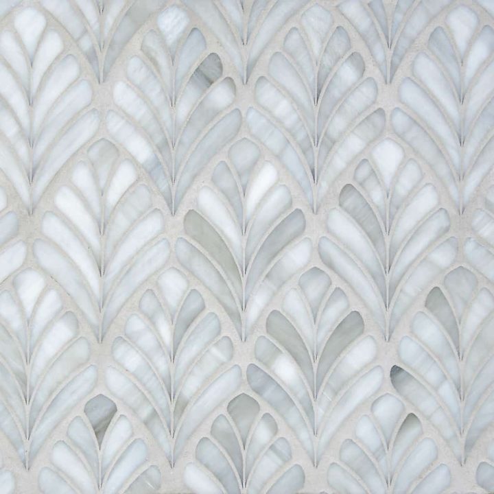 Margot, a waterjet mosaic shown in Alabaster jewel glass, is part of the Aurora® collection by New Ravenna for Decorative Materials.