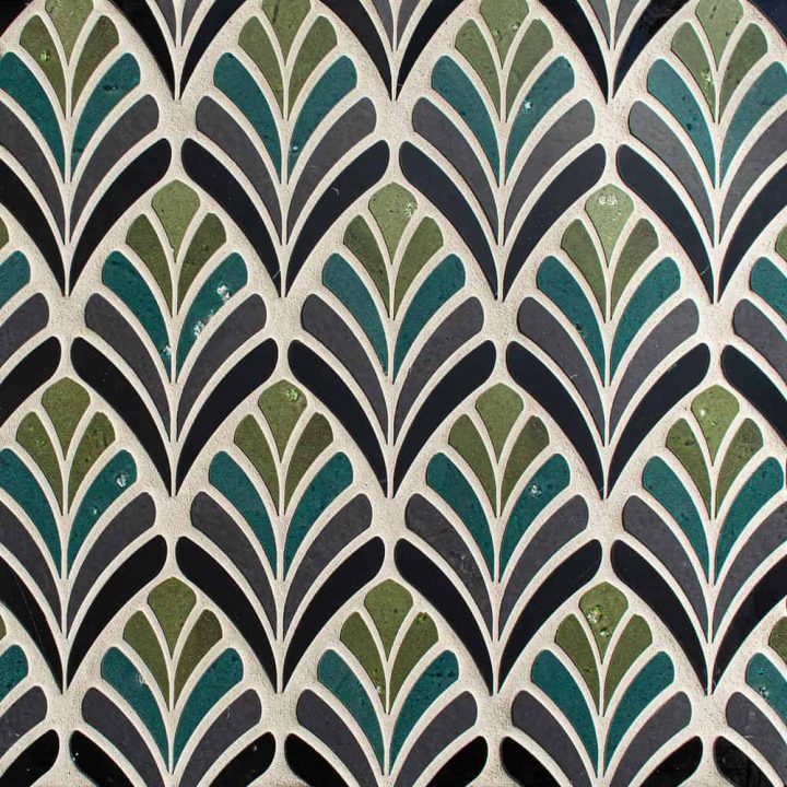 Margot, a waterjet mosaic shown in honed Orpheus Black and polished Nero Marquina with Olive and Ivy Glazed Basalto™ by New Ravenna for Decorative Materials.