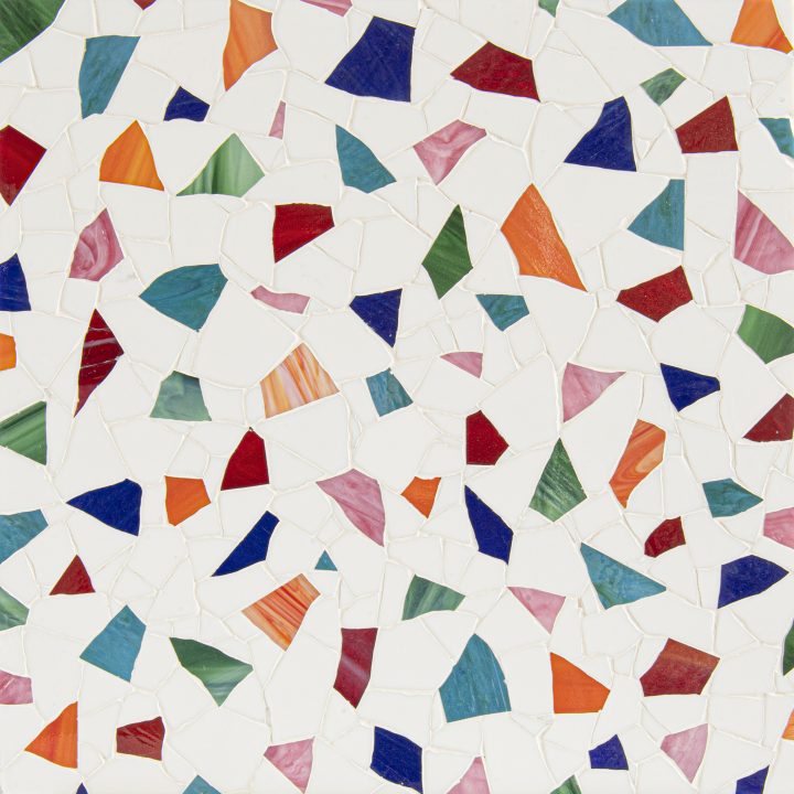 To celebrate New Ravenna’s 30th year in business, they created Heritage, a mosaic collection that journeys through three decades of design, innovation and craftsmanship by reinterpreting some of their most popular patterns and textures alongside exciting new materials. Memphis Raku Multi is a hand-cut glass mosaic shown in Sea Glass Absolute White with jewel glass Sardonyx, Ruby, Lapis Lazuli, Chrysocolla, Cat’s Eye and Morganite.