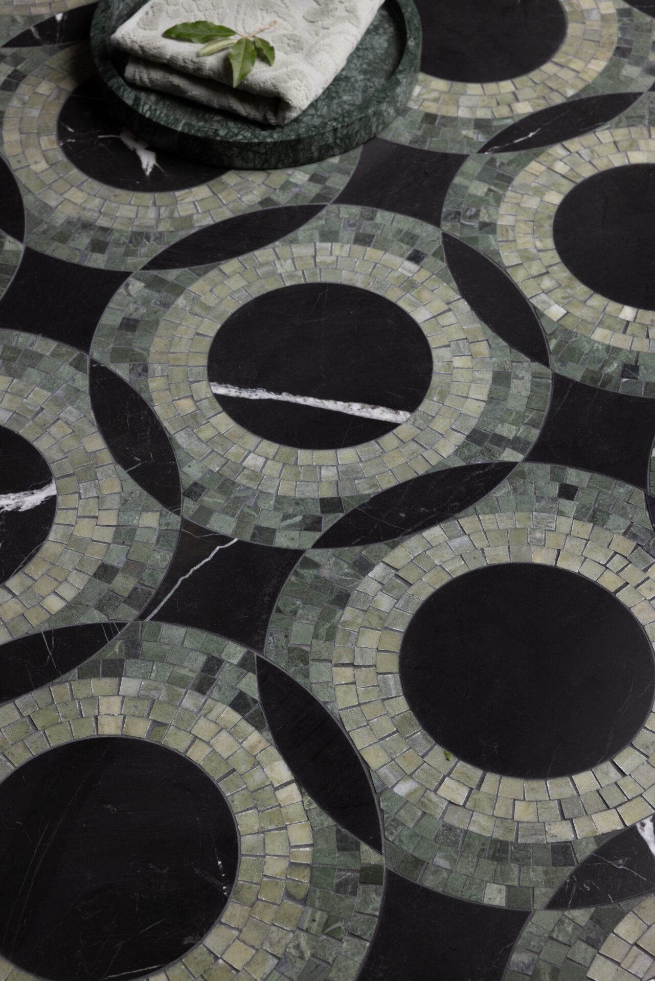 Awaken form and artistry with Musea Circle Moss Green with Verde Laguna & Tulip Black. Hand-chopped fragments create circular and diamond mosaic profiles, each surface honed to reveal rich tonal depth and quiet dimension. The result feels both storied and new—a tribute to grand museum floors, reimagined as a versatile statement for modern spaces.