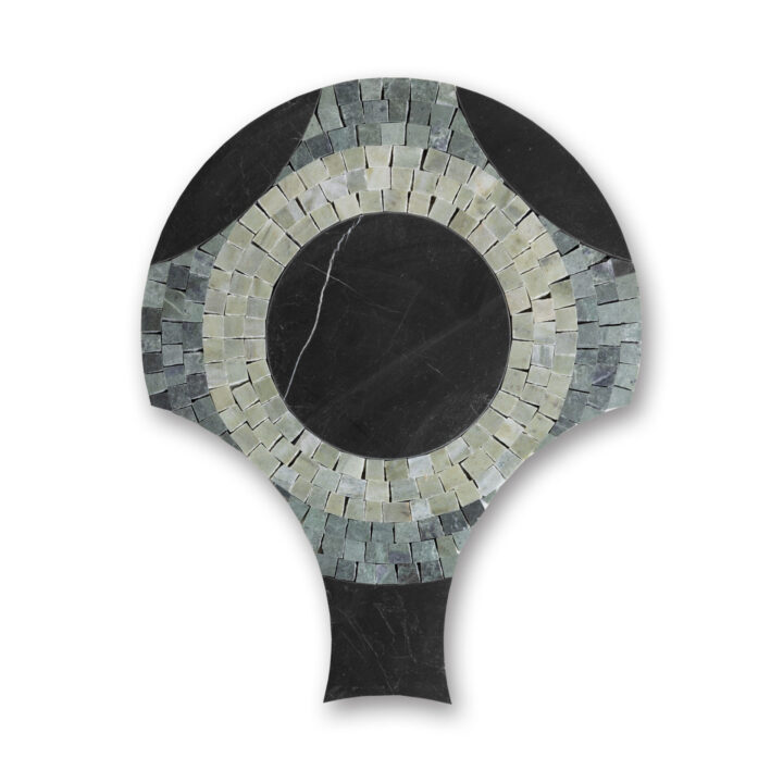 Awaken form and artistry with Musea Circle Moss Green with Verde Laguna & Tulip Black. Hand-chopped fragments create circular and diamond mosaic profiles, each surface honed to reveal rich tonal depth and quiet dimension. The result feels both storied and new—a tribute to grand museum floors, reimagined as a versatile statement for modern spaces.