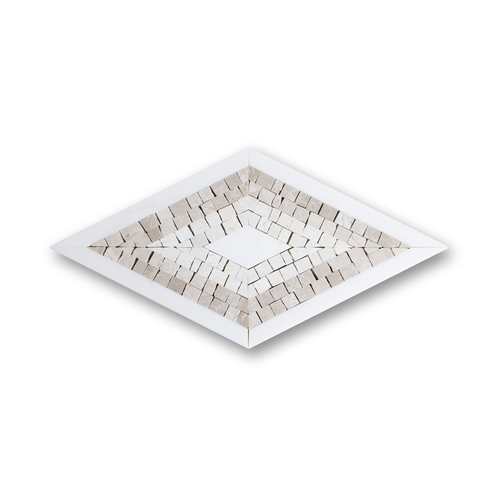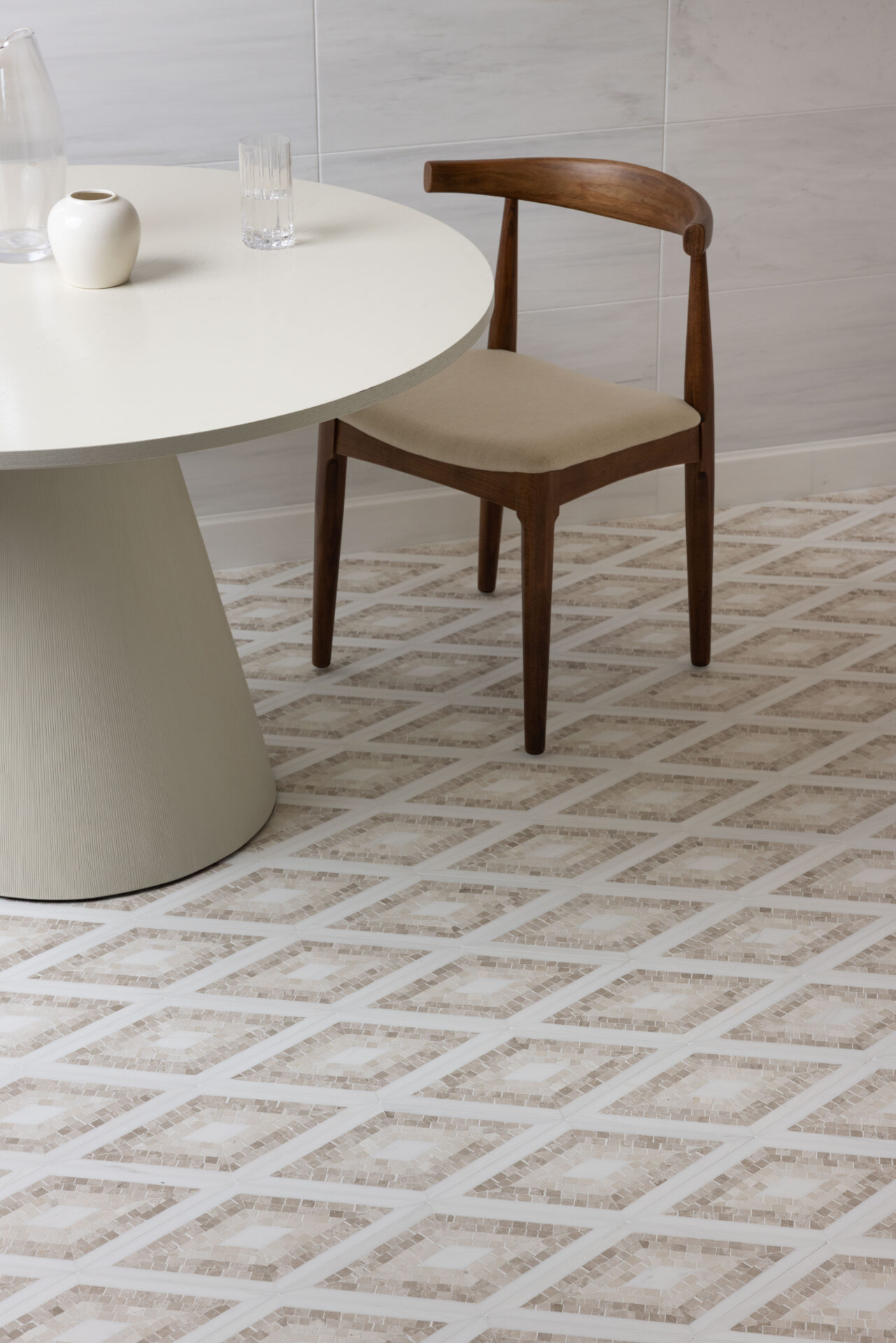 Awaken form and artistry with Musea Diamond Odeon Beige with French Vanilla & Dolomite. Hand-chopped fragments create circular and diamond mosaic profiles, each surface honed to reveal rich tonal depth and quiet dimension. The result feels both storied and new—a tribute to grand museum floors, reimagined as a versatile statement for modern spaces.