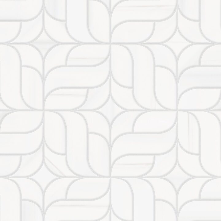The Olivia White Mosaic is from a collection of waterjet marble mosaics. High-precision machinery cuts clean lines into the stones for a sleek design. Shown in Bianco Dolomite with a brushed finish and pillowed edge.