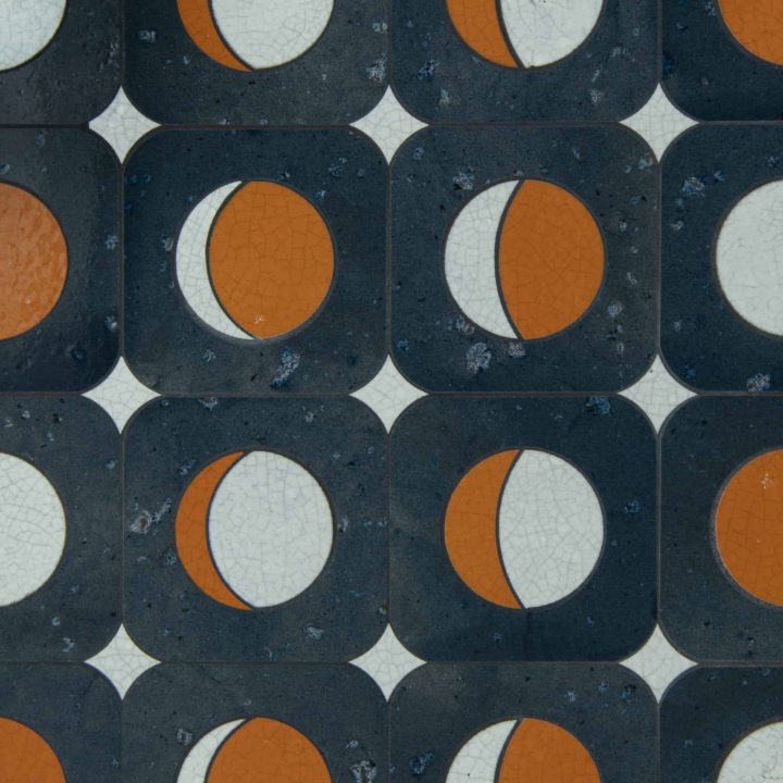 Phase to Phase, a waterjet mosaic shown in polished Orchid, Tiger Lily, and Magnolia, is part of Cean Irminger’s third Kiddo collection, Kiddo: Heyday™ available at Decorative Materials.