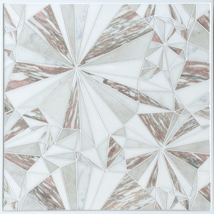 Pink Diamond Starburst is shown in Thassos (H), Bianco Dolomite (H), Calcatta Gold (H), Calacatta Luna (H) & Rosa Norwegian (H).