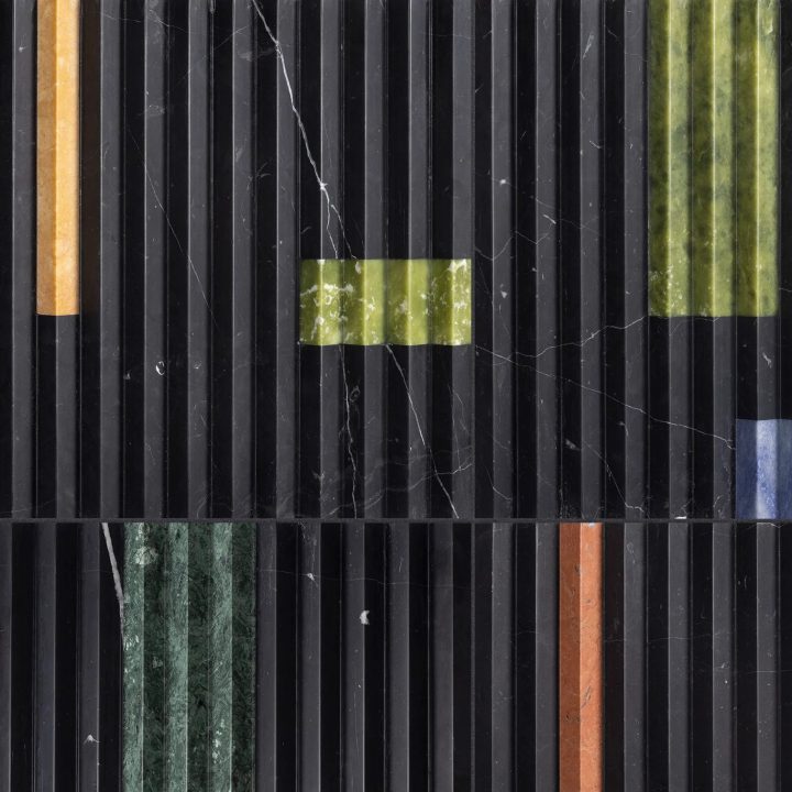 Pinnacle Fete adds variety to the modern classic Pinnacle design by inserting colorful, sculpted marbles and quartzites in a rhythmic patchwork within the carved, triangular flutes of the background stone.Pinnacle Fete is offered in two colorways: Nero, with rich blues, greens, pinks and gold against a ground of white-veined Nero marble; and Pastel, with multi-color marble inlays in a range of soft pale shades, on a ground of crystalline Igloo marble. The full repeat is 24″ × 24″, created by four distinct 12″ × 12″ parts. The scintillating visual rhythm of the repeat will create walls of true sophistication.