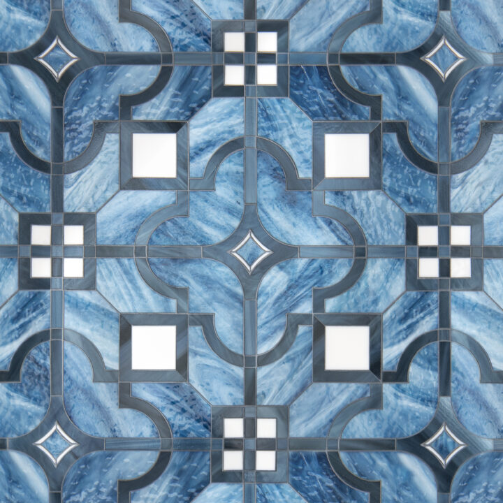 Place des Vosges is a waterjet glass mosaic shown in Absolute White, Angelite and Marcasite.