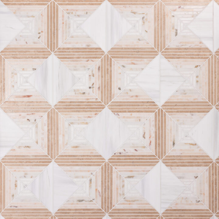 Pleat is a quadrilateral repeat pattern, reminiscent of the intricate folds of origami. Its surface mimics delicate paper-like creases, and each tile features rows of cascading lines and chromatic tones. From the Made in America Tailored To Collection, Pleat is a custom waterjet mosaic, crafted entirely in-house and made in the USA. Customize this pattern with a wide variety of stone or glass materials. Your custom product will be totally unique and made-to-order.