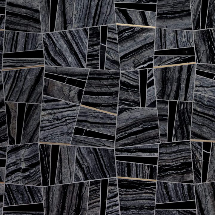 Linear, powerful, and asymmetrical, Quickstep is an interpretive representation of the dance that inspired its name. Be swept away in this rhythmic stone pattern, perfectly paired with striking brass accents. Quickstep is an elegant mix of materials that will complement any space.