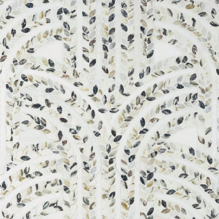 The Riviera 3 waterjet from the Bordeaux Collection showcases a delicate and intricate design. This design features sweeping arches that intertwine, seamlessly harmonizing organic elements with a modern aesthetic.