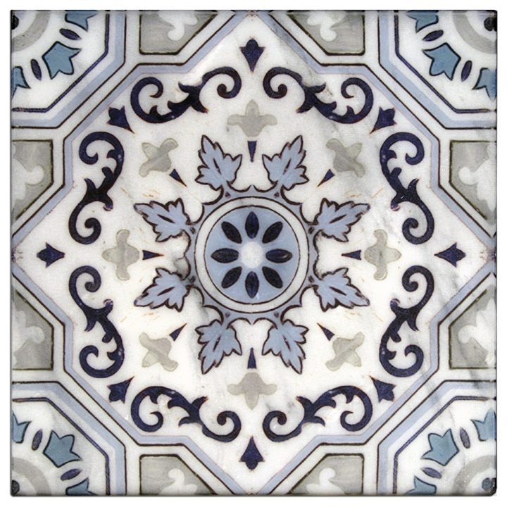 - Quick ship pattern is available on Carrara or Perle Blanc stones in Sea Mist, Sesame and Snowflake Blue colorways. Custom colorways and 12" x 12" size option available. Contact us for details.