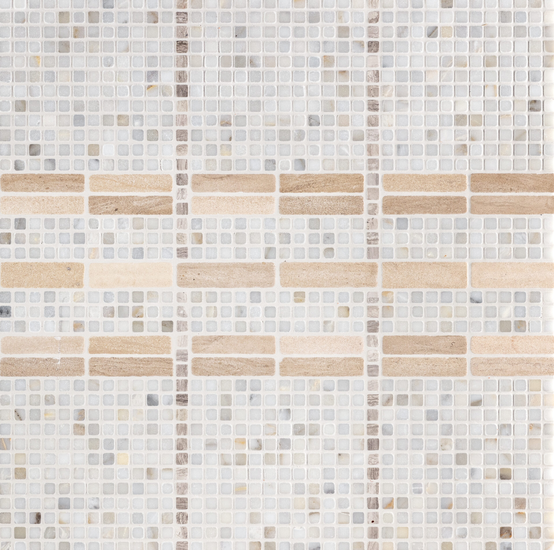 Shadow Stripe Moca Mosaic is from a collection inspired by the timeless appeal of stripes and plaids. The Handloom Collection offers three distinct patterns for countless design possibilities. This pattern weaves together small mosaic chips with a bold, thicker stripe at its center. This reinterpretation of a classic pattern is available in Pink, Moca, and Viola colorways. It combinines soft, luxurious stones like Rosa Perlino, Calacatta Gold, Bianco Antico, Belgian Blue, and Viola, in serene, understated palettes.