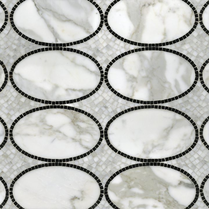 Solid Ovals, a waterjet and hand-cut mosaic shown in polished Calacatta Tia and Nero Marquina.
