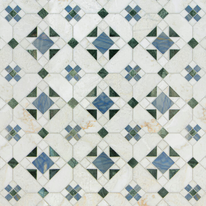 Starlight is a hand-cut and waterjet mosaic shown in honed Cloud Nine, polished Blue Macauba and Spring Green.