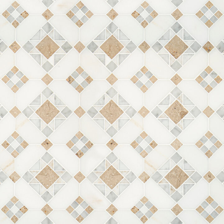 Starlight is a hand-cut and waterjet mosaic shown in honed Calacatta Monet, Carrara and Jura Beige.
