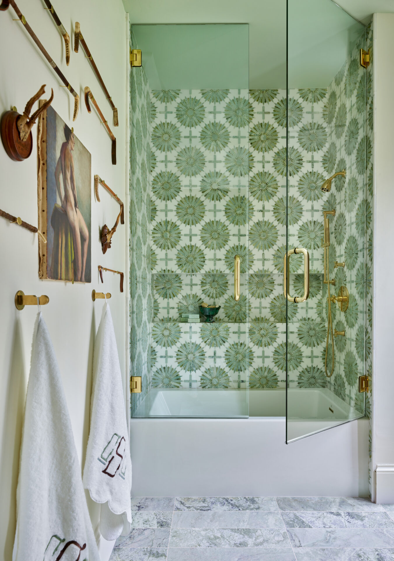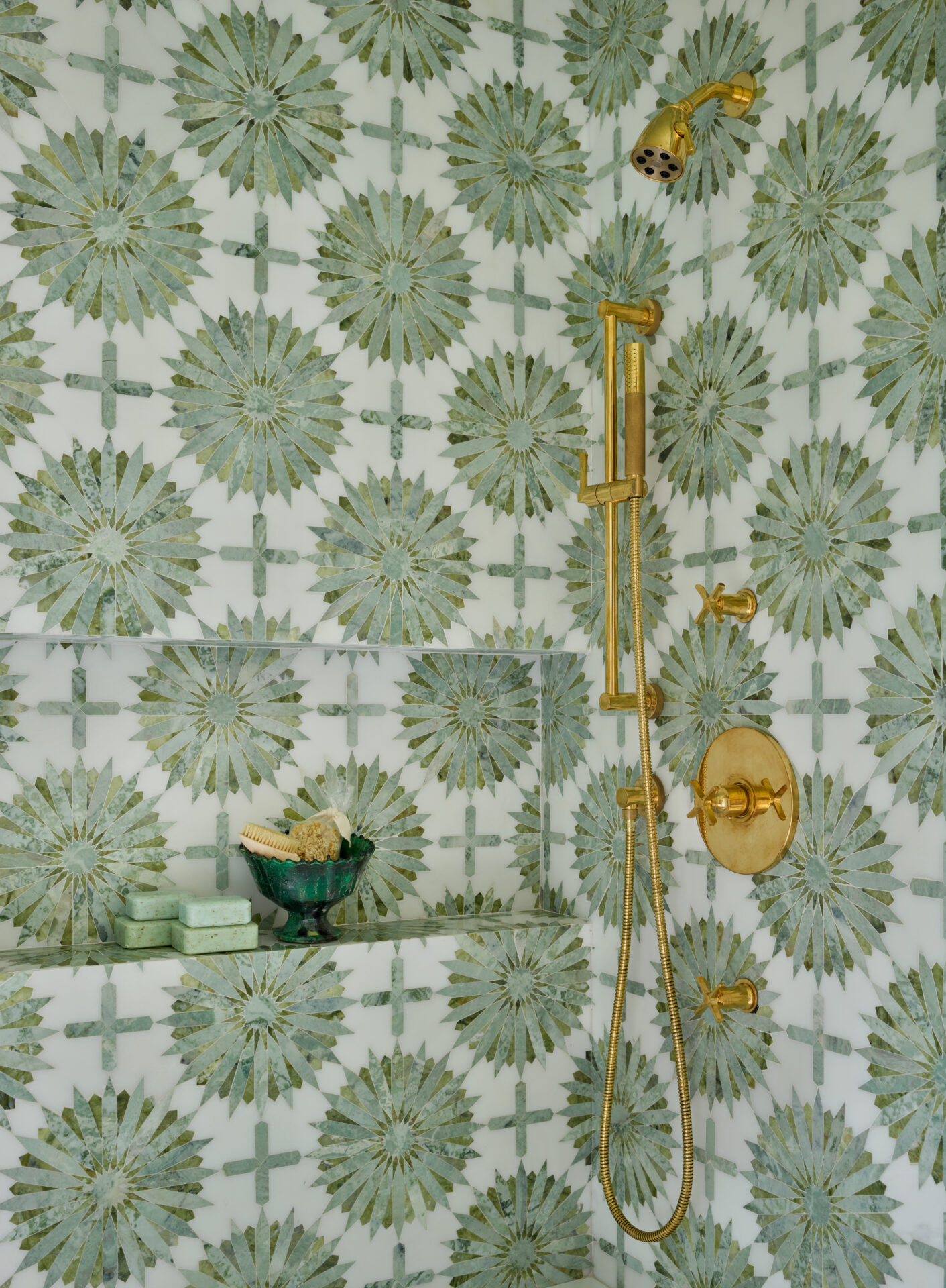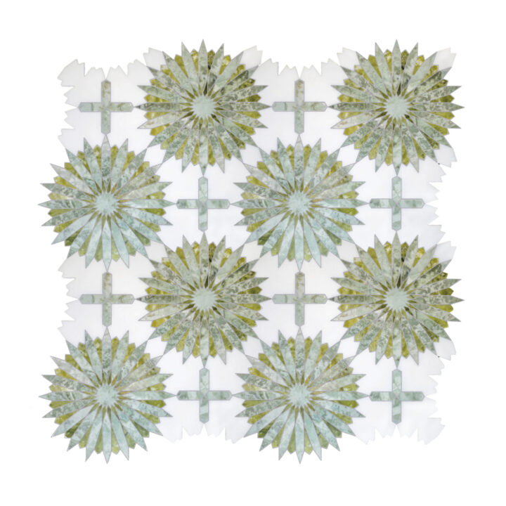 The Stella Green Waterjet Mosaic is from the Grandview Collection. This design combines honed white marble with Pasine Green and Verden Green for a striking contrast. Vibrant veining flows through each piece—sometimes subtle, sometimes bold—creating a one-of-a-kind stone surface with natural elegance.