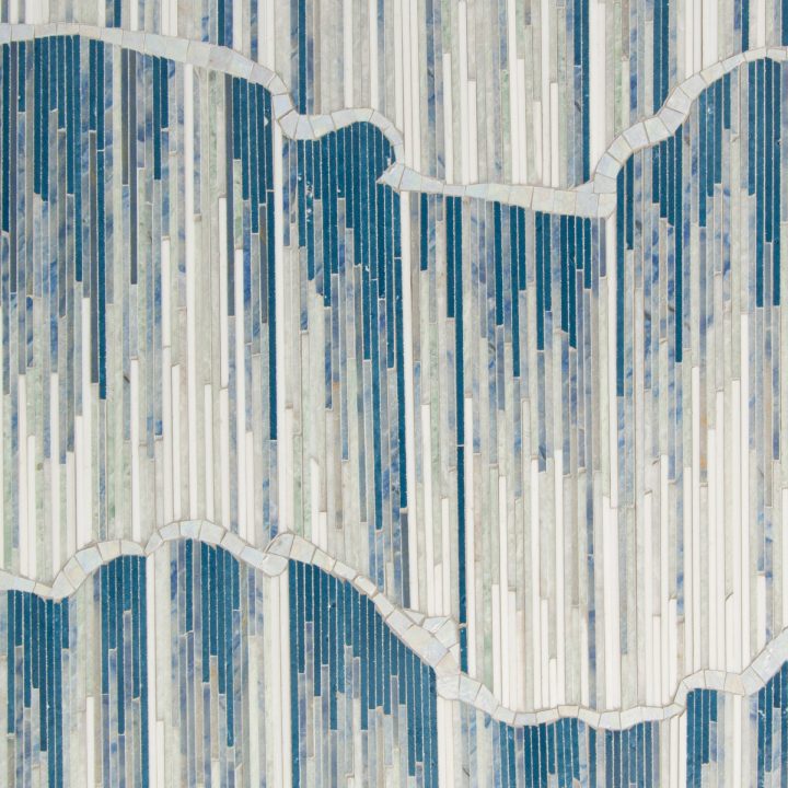 Stratum, a hand-cut stone mosaic shown in polished Moonflower, Cornflower, Blue Macauba, Ming Green, and Dolomite, is part of the Biome collection by New Ravenna.