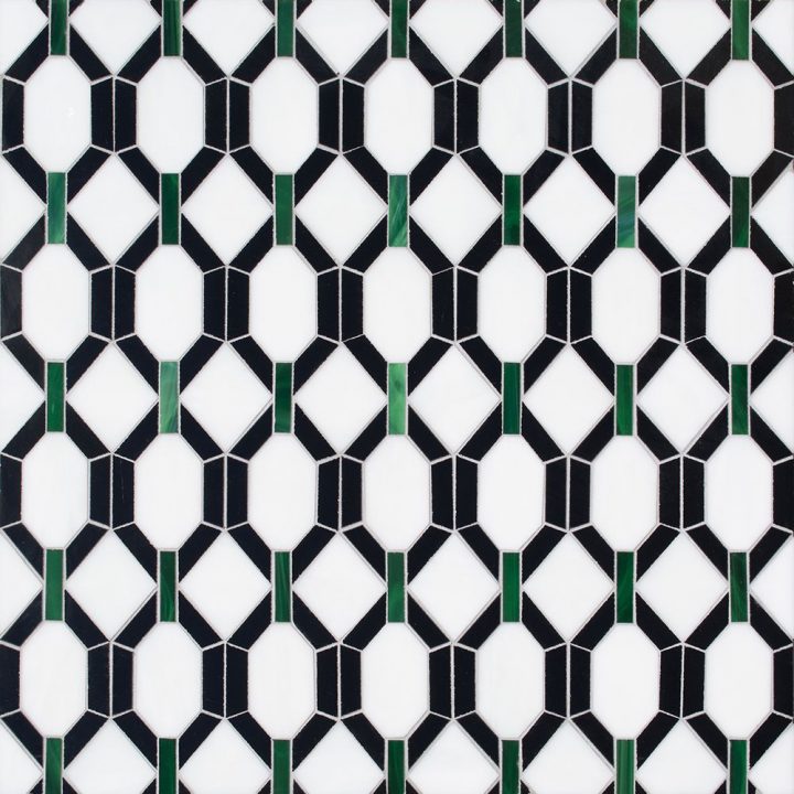 Tanzanian Trellis, a waterjet mosaic shown in Cats Eye, Absolute White, and Obsidian jewel glass. Designed by Joni Vanderslice as part of the J. Banks Collection. Dimensions reflect image shown.