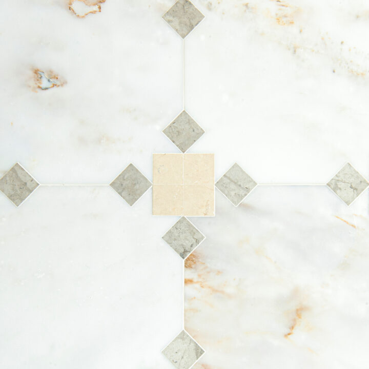 Tianguis is a hand-cut and waterjet mosaic shown in honed Calacatta Monet, Jerusalem Gold and Palomar.