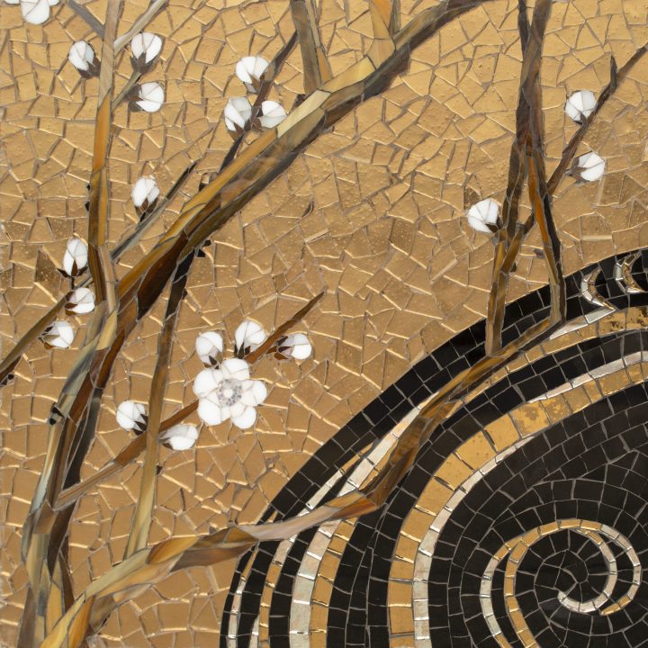 Wave and Blossom, a hand-cut jewel glass mosaic shown in Tortoise Shell, Amber, Tiger’s Eye, Jasper, Obsidian, 24K Gold, Dawn Mirror, Moonstone, Alabaster, Champagne, and Rhodolite with honed 24K Gold, is part of the Gracie collection by New Ravenna for Decorative Materials.