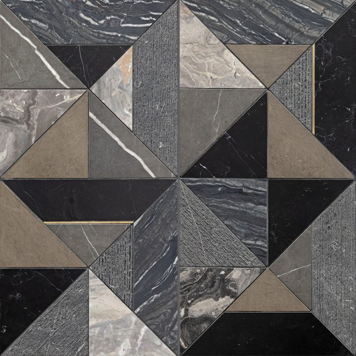 Offered in a rich and moody black blend, Westwind’s triangles and bisected pyramids create a bold and intricate geometry. Honed Grey Foussana limestone and Grafite, Arabescato Orobico, and Silverwave marbles are given extra intensity with the inclusion of textured Nero marble and linear brass accents. Westwind was inspired by the custom mosaic created by the gifted kitchen designer Richard Anuskiewicz for Artistic Tile’s working kitchen at our Showroom & Slab Gallery at the Nashville Design Collective.