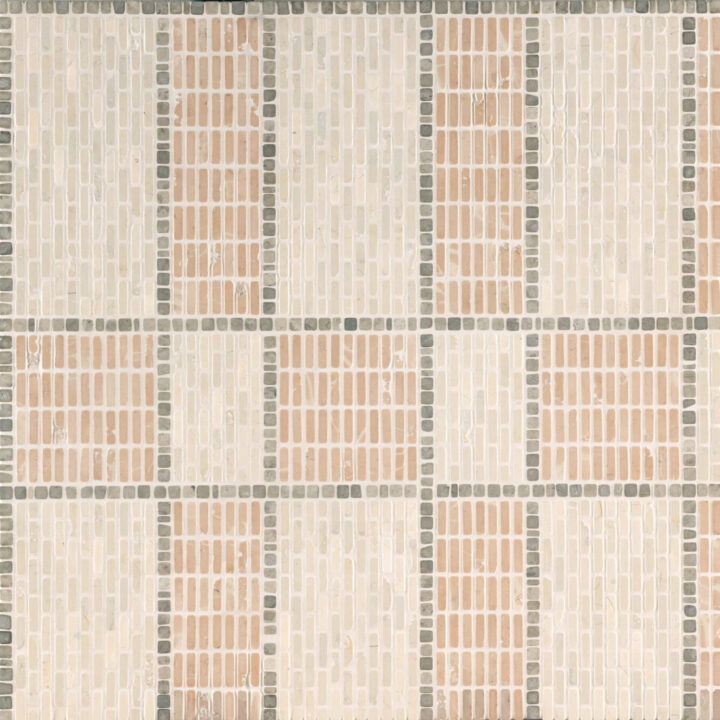 Windowpane Plaid Pink Mosaic is from a collection inspired by the timeless appeal of stripes and plaids. The Handloom Collection offers three distinct patterns for countless design possibilities. Windowpane Plaid presents an elegant checkerboard of varied rectangles. This reinterpretation of a classic pattern is available in Pink, Moca, and Viola colorways, combining soft, luxurious stones like Rosa Perlino, Calacatta Gold, Bianco Antico, Belgian Blue, and Viola, in serene, understated palettes.