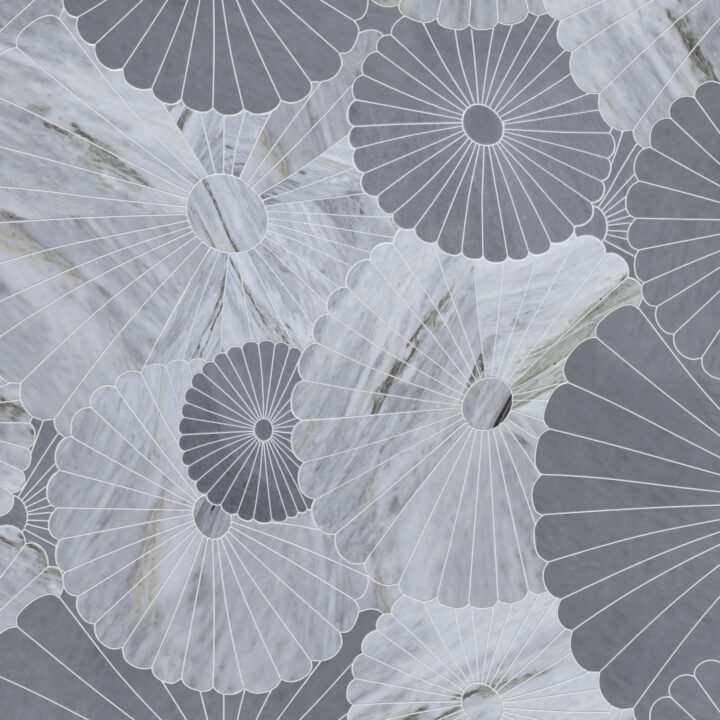 XOXO, part of the French Quarter Collection, is a waterjet stone mosaic. Pictured here in Light Bardiglio (Polished) and Pacifica Blue (Honed).